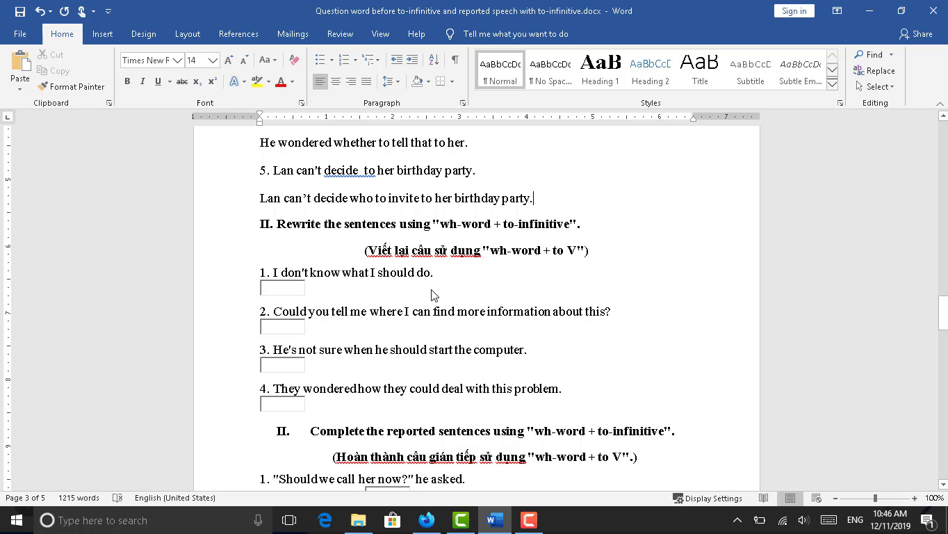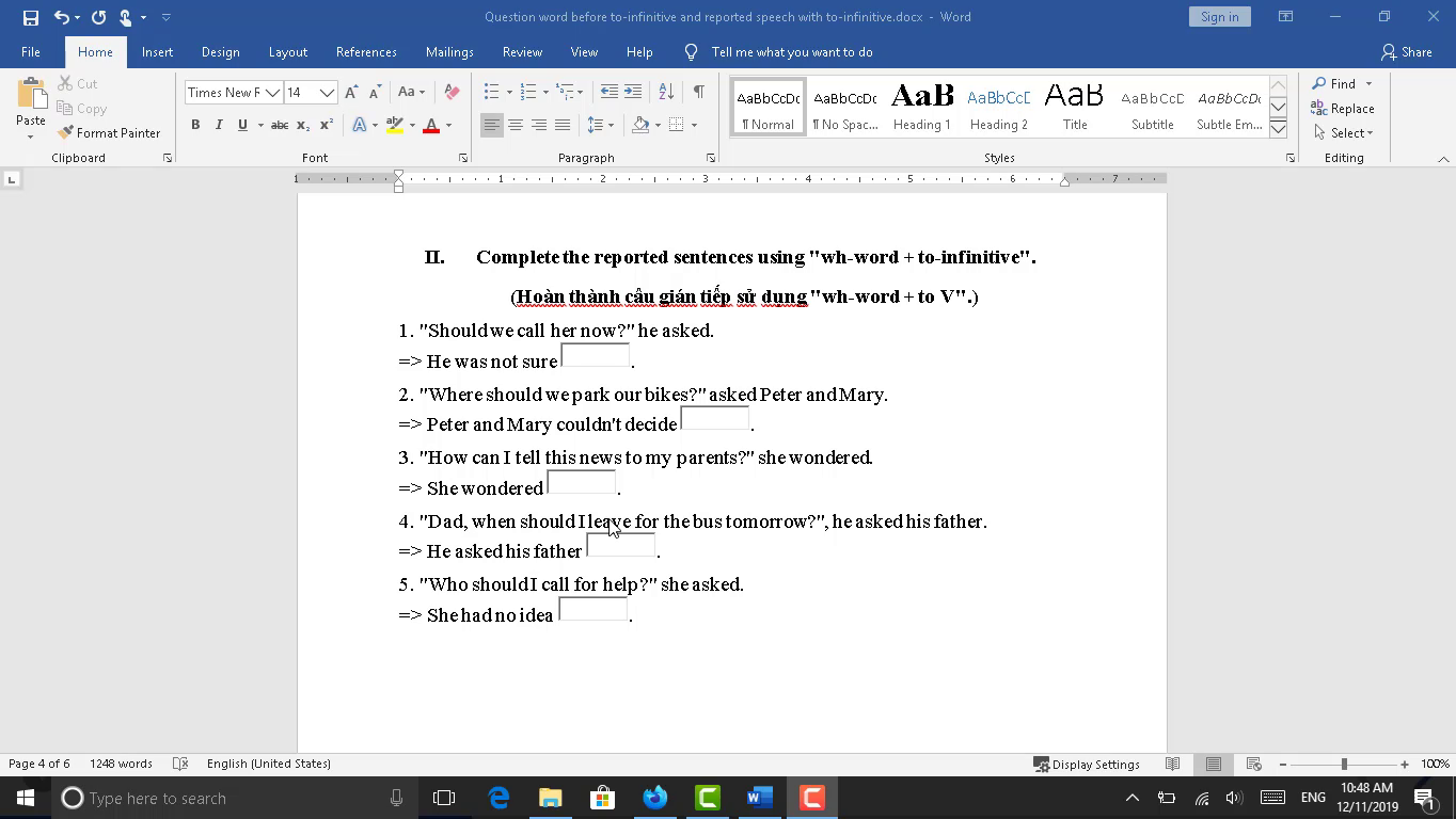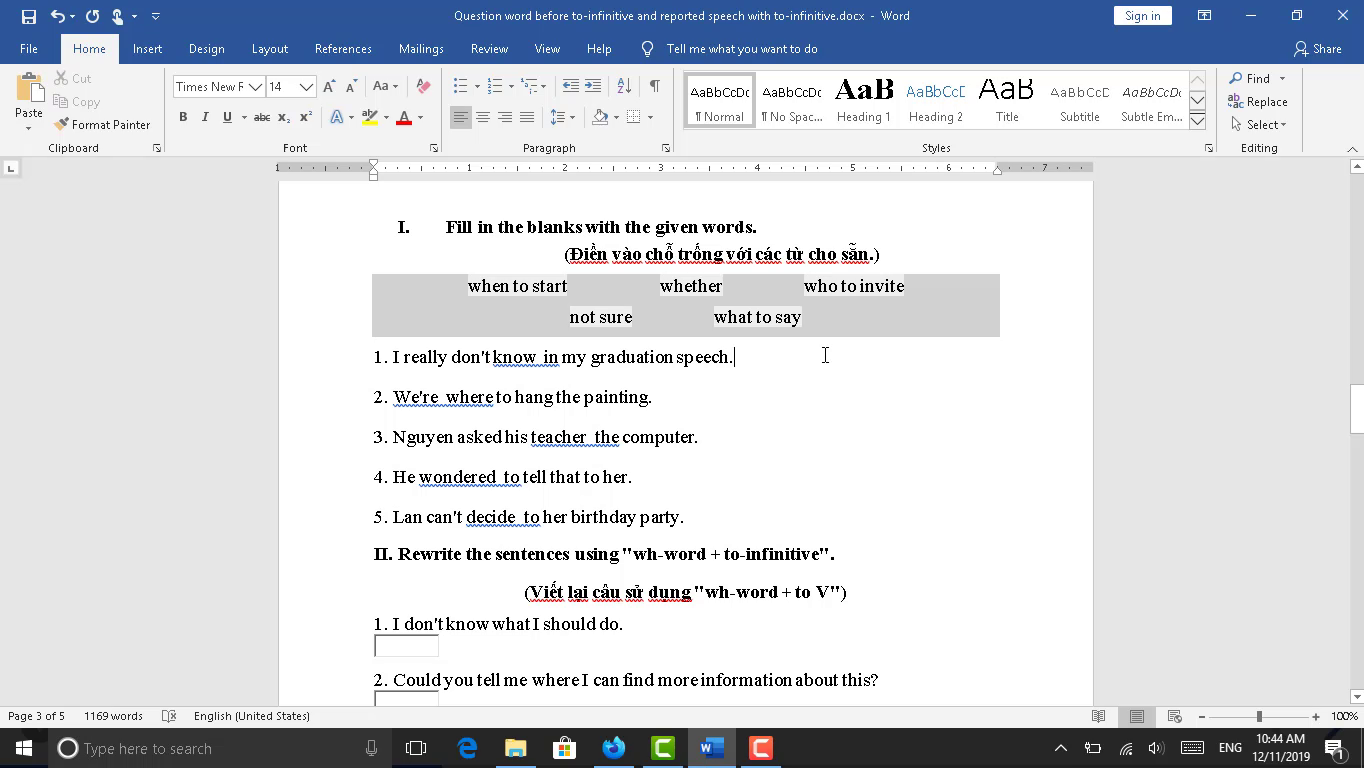 Bài 10 - Bài tập câu gián tiếp có từ để hỏi và to - Điền từ